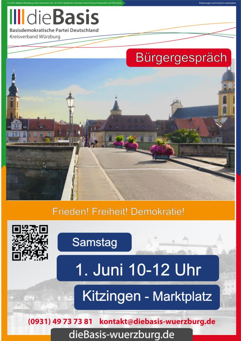 Wir laden Dich recht herzlich zu unserem Bürgergespräch „dieBasis informiert – Frieden! Freiheit! Demokratie!“ ein und freuen uns auf Deinen Besuch, inspirierende Gespräche, einen lebendigen Austausch sowie Fragen, welche wir gerne beantworten. Parkplätze Die Parkplätze der WVV (Bahnhofstraße), der Marktgarage…