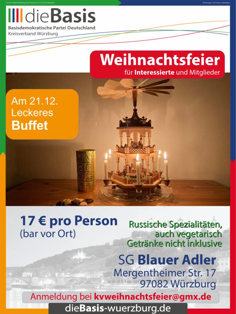 Wir laden alle Mitglieder recht herzlich zu unserer 14-tägigen Parteiversammlung ein. Treffpunkt ist jeden zweiten Donnerstag, um 18:30 Uhr im griechischem Restaurant „zur Feggrube“, Heiner-Dikreiter-Weg 1, 97074 Würzburg in der Nähe der Carl-Diem-Halle (tectake Arena, ehemals s.Oliver-Arena).