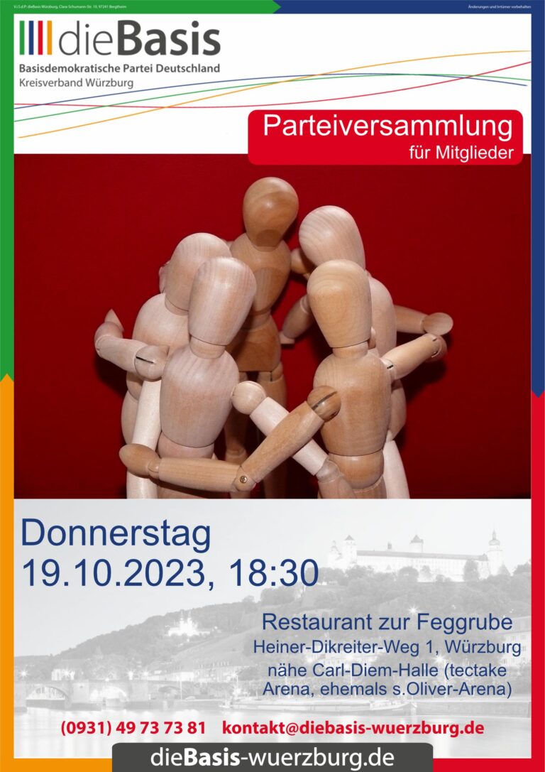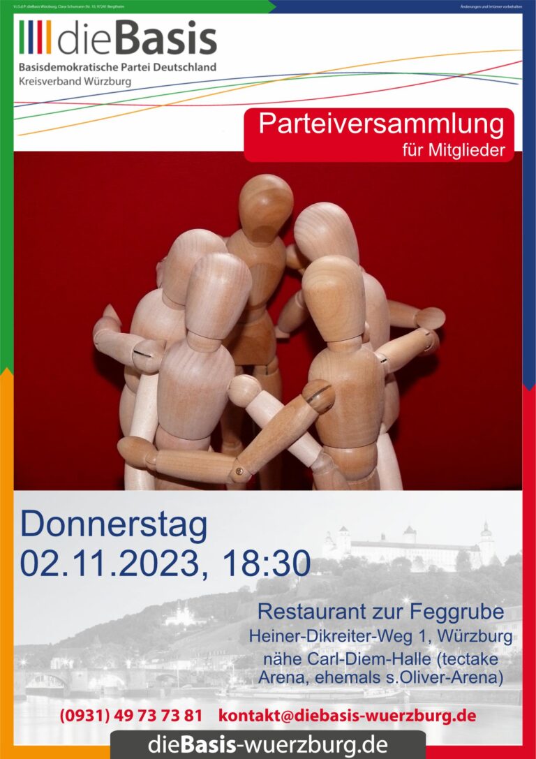 Wir laden alle Mitglieder recht herzlich zu unserer 14-tägigen Parteiversammlung ein. Treffpunkt ist jeden zweiten Donnerstag, um 18:30 Uhr im griechischem Restaurant „zur Feggrube“, Heiner-Dikreiter-Weg 1, 97074 Würzburg in der Nähe der Carl-Diem-Halle (tectake Arena, ehemals s.Oliver-Arena).