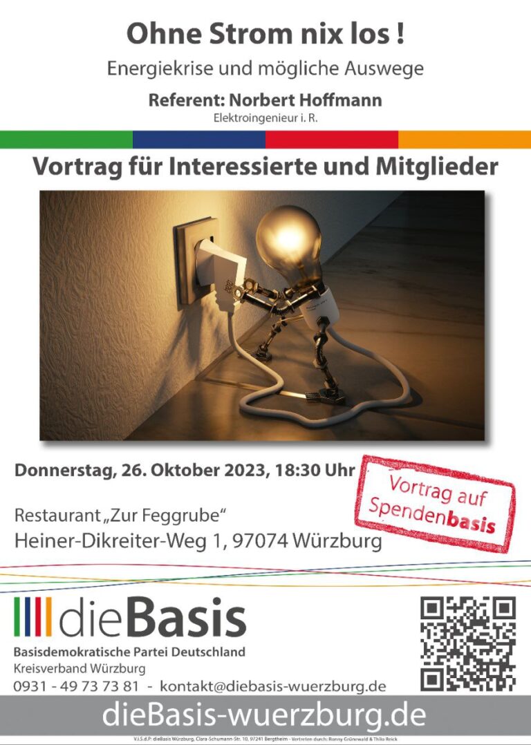 Energiekriese und mögliche Auswege Wir laden recht herzlich zum Vortrag „Ohne Strom nix los!“ am Donnerstag, den 26. Oktober 2023 um 18:30 Uhr im Restaurant Zur Feggrube, Heiner-Dikreiter-Weg 1, 97074 Würzburg ein. Der Vortrag zeigt die Gründe für die gegenwärtige…