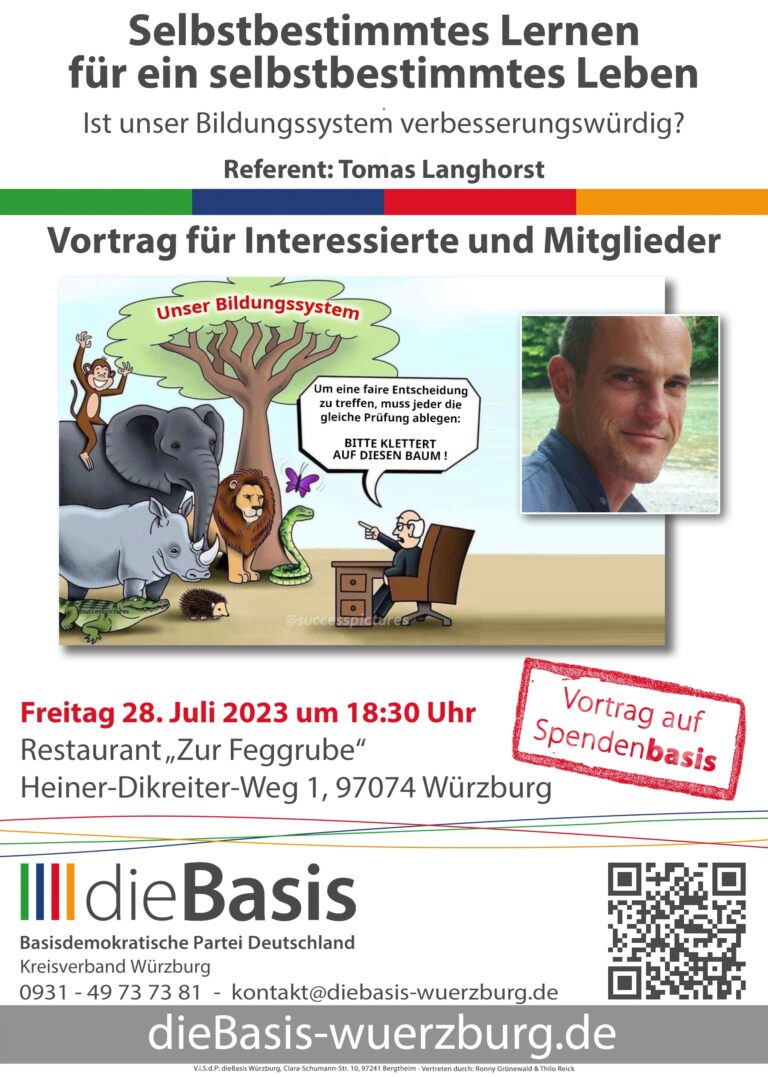 Ist unser Bildungssystem verbesserungswürdig? Wir laden recht herzlich zum Vortrag „Selbstbestimmtes Lernen für ein selbstbestimmtes Leben“ am Freitag, den 28. Juli 2023 um 18:30 Uhr im Restaurant Zur Feggrube, Heiner-Dikreiter-Weg 1, 97074 Würzburg ein. Horror-Beschreibungen unseres Bildungssystems stehen gegen Jubelarien…