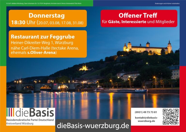 Liebes dieBasis Mitglied im Kreisverband Würzburg, hiermit laden wir dich ganz herzlich zur satzungsgemäßen Mitgliederversammlung des Kreisverbandes Würzburg der Basisdemokratischen Partei Deutschland ein. Datum: Donnerstag, 13. Juli 2023 um 18:30 Uhr (Beginn: 18:45 Uhr)Ort: Restaurant „zur Feggrube“, Heiner-Dikreiter-Weg 1, 97074…